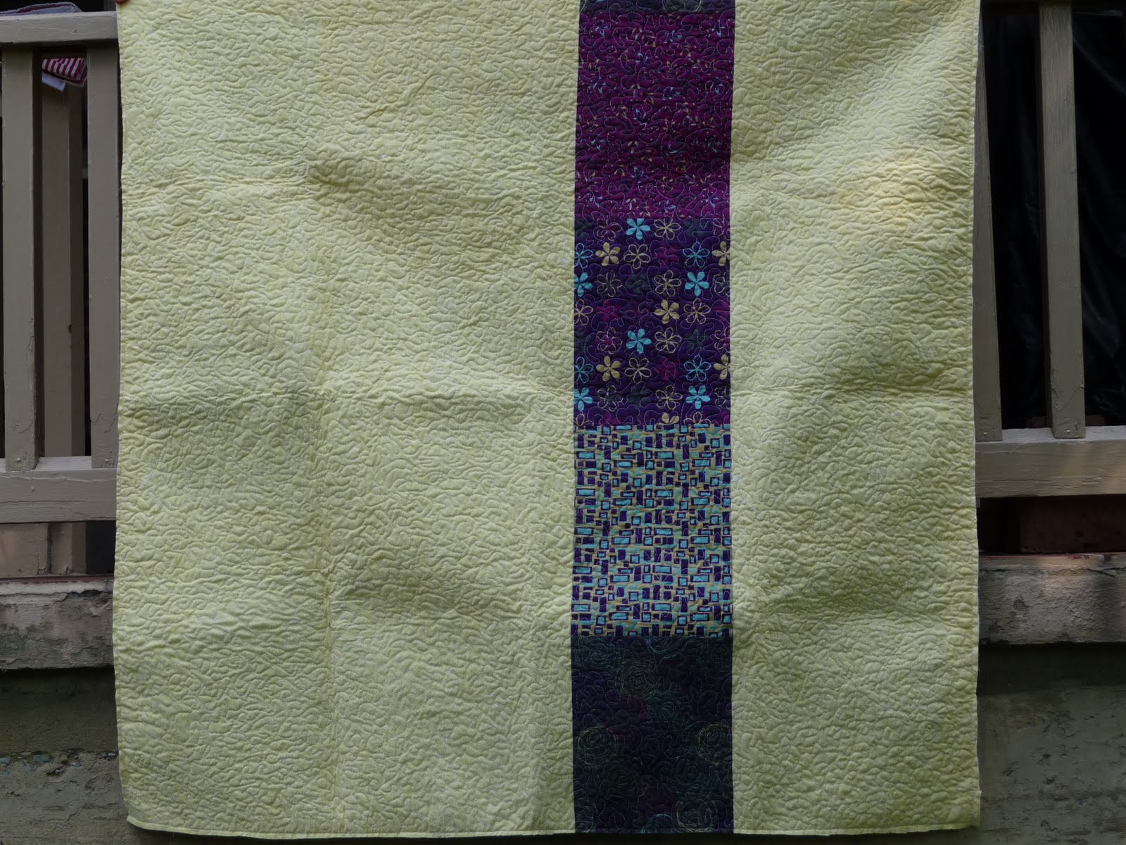 The second quilt is one that my friend Dixie asked me to make for her. She requested "purples" and "masculine" (she's so kind to her husband!) so I hope it delivers! I really like the gray and the dark indigo. The yellow on the back lightens the quilt up a little bit, but isn't too bright or feminine in my opinion. It measures about 45"x45".